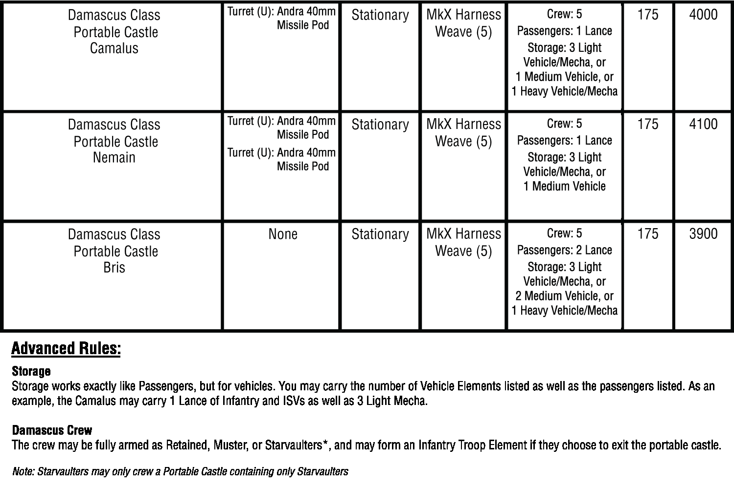 Open the Hanger – A troop element inside the Portable Castle may use an action to open the hanger doors. This is the ONLY way for ISV’s to enter the Portable Castle